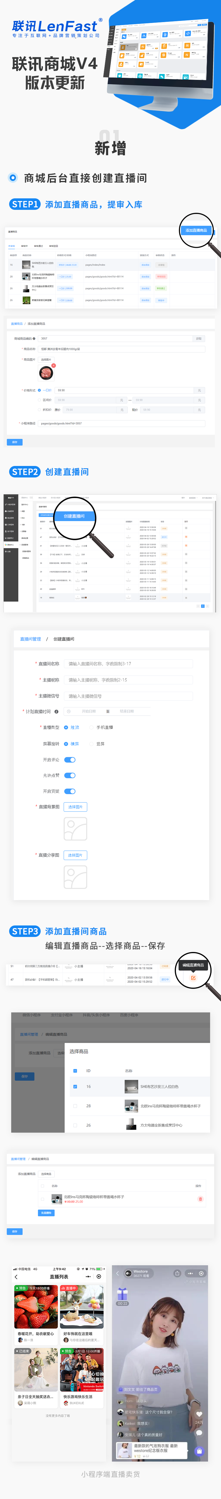 现在,商家在联讯商城后台就能创建直播间、添加直播商品,大大简化了操作步骤,以后做直播卖货就更方便了!