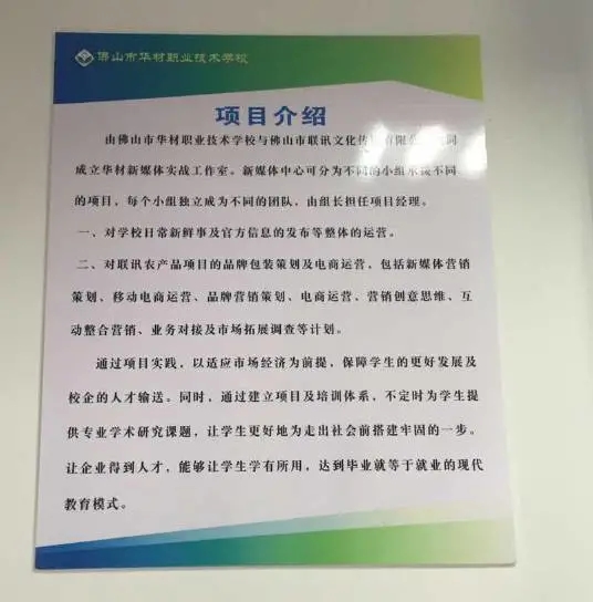 新媒体工作室主要由华材校友创立的佛山市联讯文化传播公司引入项目,派出技术人员,带领学生进行实践经营。 项目涉及项目的品牌包装策划及电商运营,包括新媒体营销策划、移动电商运营、品牌营销策划、电商运营、营销创意思维、互动整合营销、业务对接及市场拓展调查等计划。